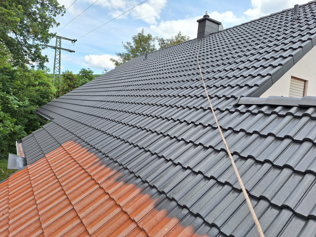 Wir Reinigen die Betonoberfläche mit einem Speziellem Dachflächenreiniger, mit Hochdruck von ca. 270 bar und bis zu 95 Grad heißem Wasser. So entfernen wir gründlich jeden Schmutz, Moose, Algen, Pilze und Flechten. Durch die besonderen Eigenschaften des Reinigers, der einen effektiven Spritzschutz bietet und sehr schonend die Dachziegel reinigt, wird ein hervorragendes Ergebnis erzielt, ohne die Fassade, das Grundstück oder die Häuser der Nachbarn zu verschmutzen, wie es z.B. beim arbeiten mit normalen Fräsen vorkommt. Wir haben nun die perfekte Basis für die Beschichtung spezieller Dachfarben, die in verschiedenen Farben erhältlich ist geschaffen.