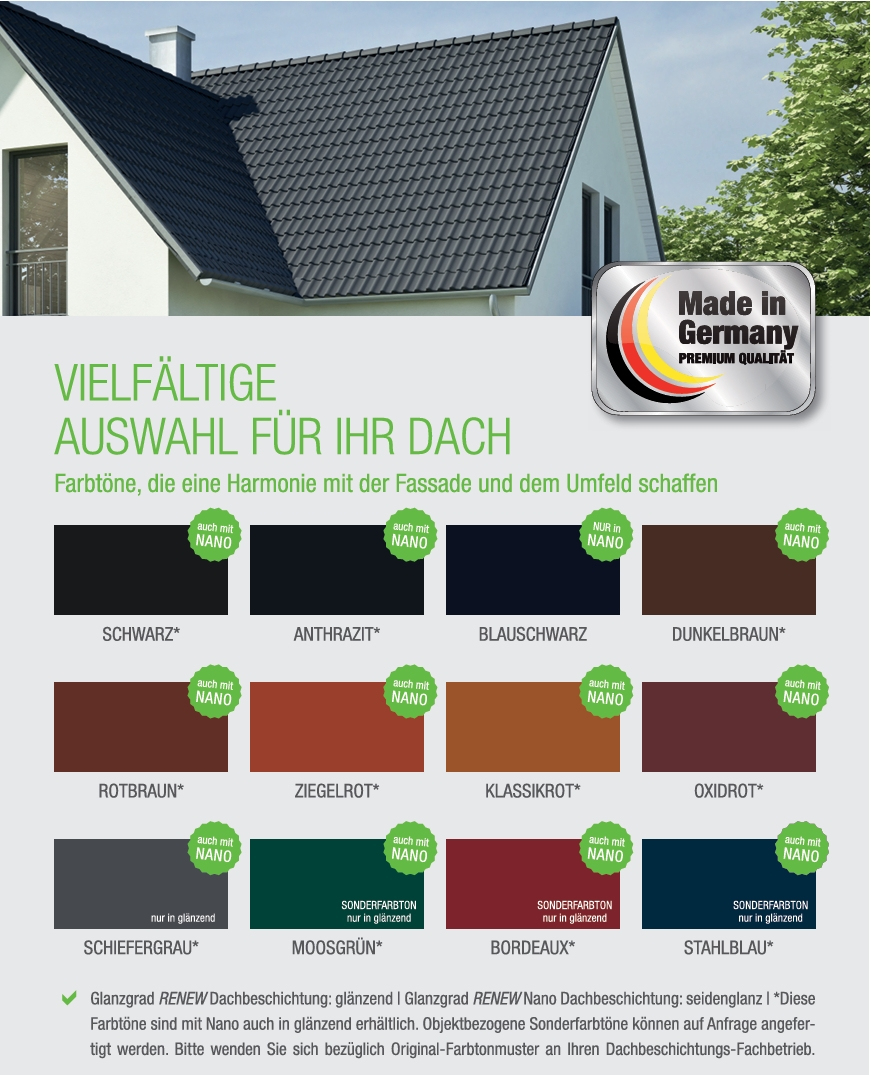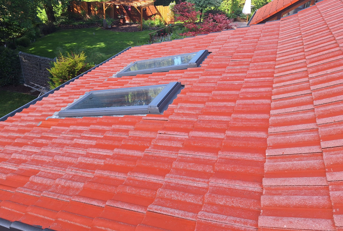 Im ersten Schritt werden alle nicht mit zu beschichtenden Teilen wie Fenster, Verblendungen oder Einfassungen abgeklebt. Dann wird eine tief eindringende und stark verfestigende Grundierung aufgebracht, um eine optimale Haftung der Farbe zu gewährleisten. Im Anschluss wird die Farbe in zwei Schichten mit trocknungspfase aufgetragen. Nach der Aushärtung der Beschichtung erstrahlt Ihr Dach in einem seidenglänzenden Ton und wird sie begeistern.